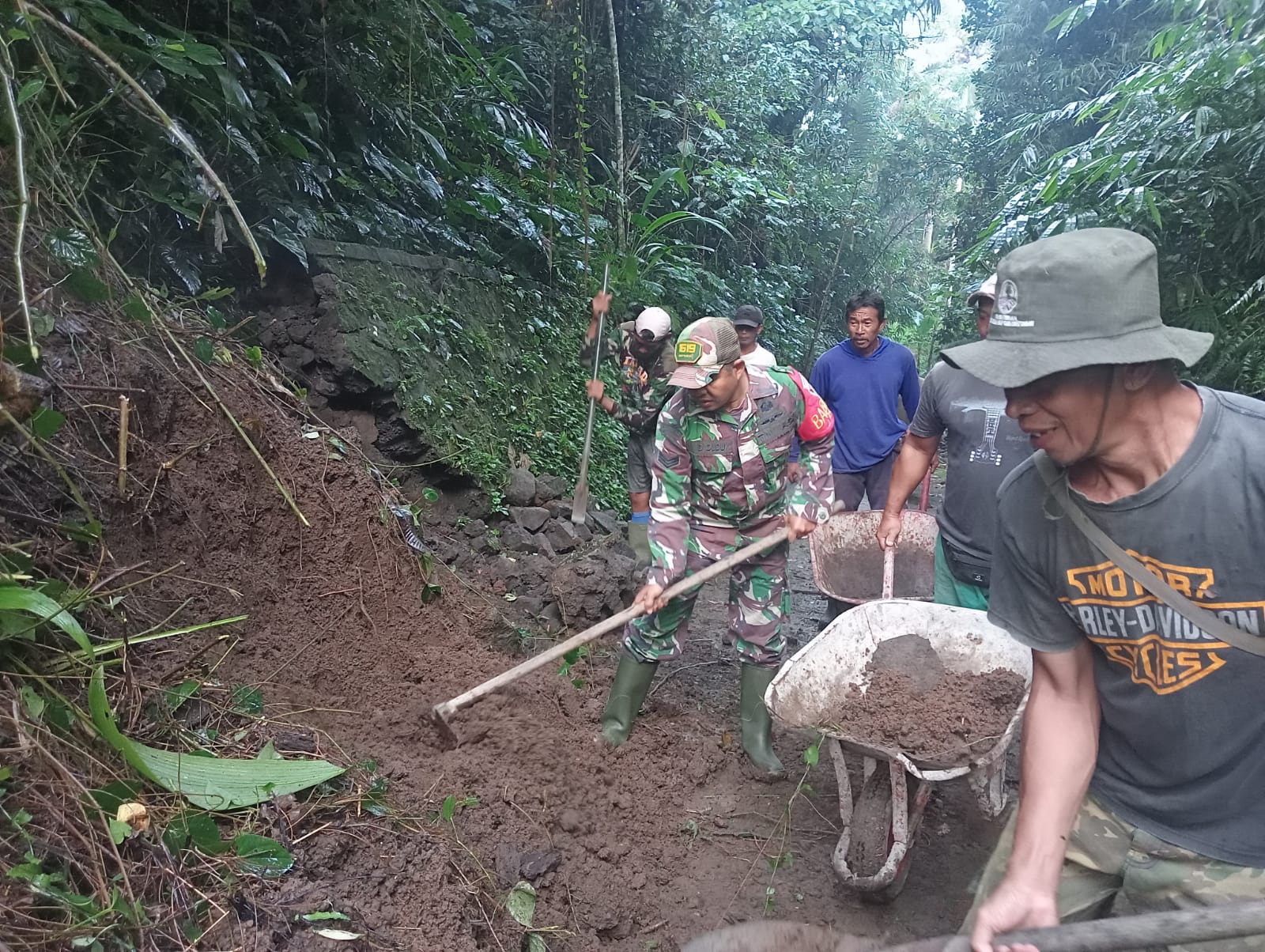 TabananĀ tabloidtipikornews com- Babinsa Desa Jegu, Koramil 1619-08/Penebel, Serka I Made Duduk, bersama warga masyarakat melaksanakan kegiatan kerja bakti gotong royong pembersihan longsoran tanah yang menutupi jalan menuju Pura Dalem Adat Jegu, Banjar Dinas Cepag, Desa Jegu, Kec.Penebel, Selasa (15/7/2025).
