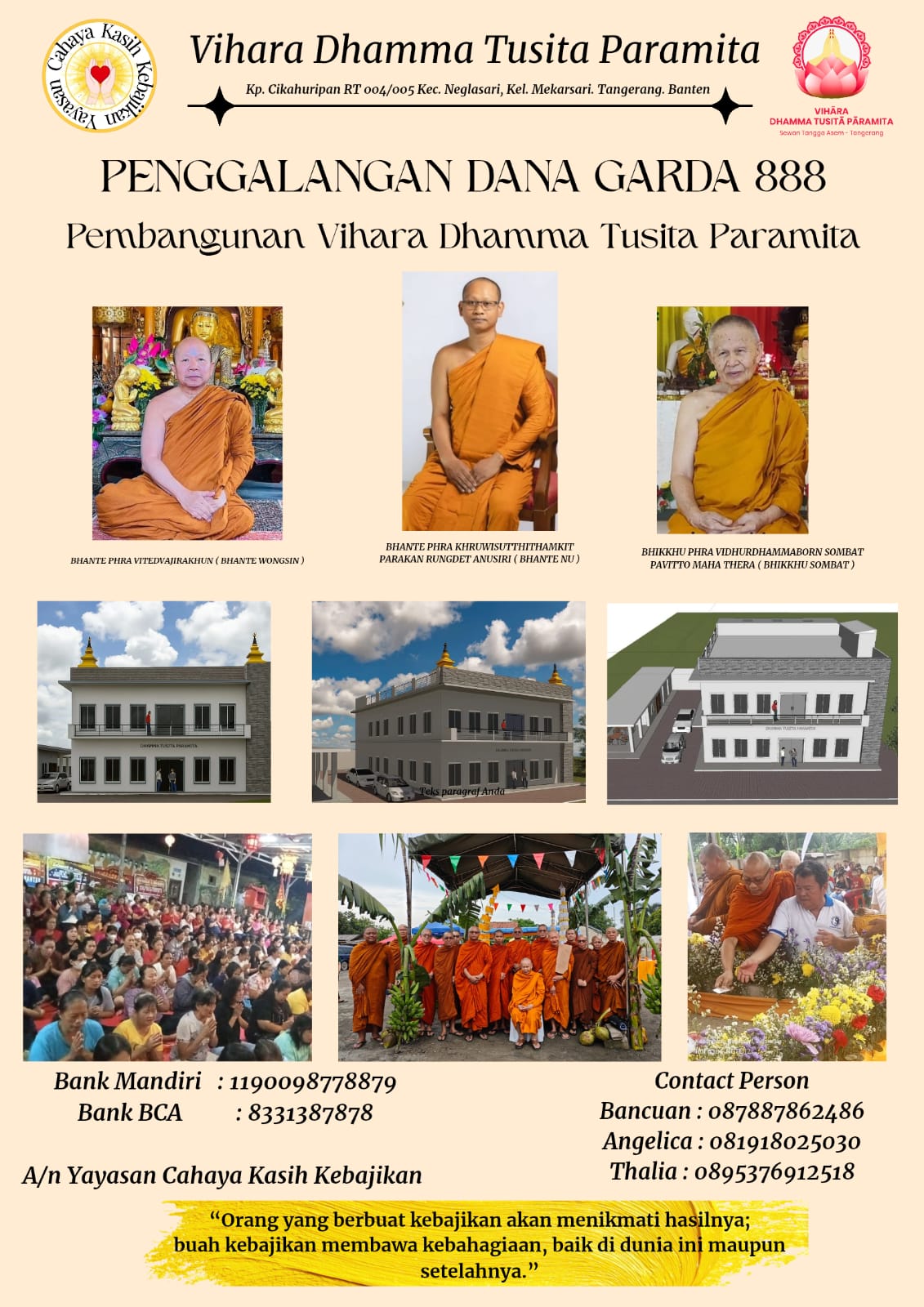 Dalam rangka pembangunan sarana ibadah dan pusat kegiatan spiritual umat Buddha, Vihara Dhamma Tusita Paramita mengajak para dermawan, umat, dan masyarakat luas untuk berpartisipasi dalam program Penggalangan Dana Garda 888.