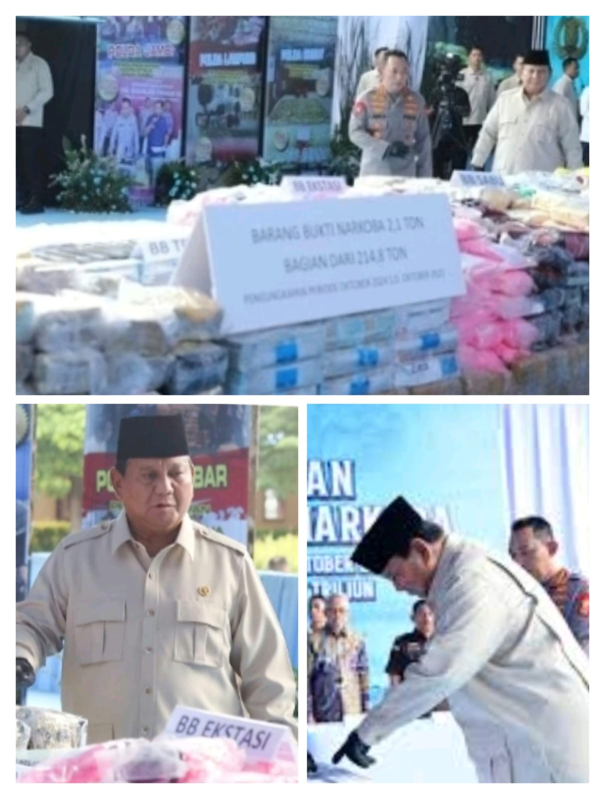 “Pemusnahan barang bukti narkoba hasil bekerjanya Polri selama satu tahun Oktober 2024 sampai Oktober 2025 yang berhasil mereka sita, rebut, adalah 214,84 ton, yang nilai uangnya Rp 29,37 triliun,” kata Prabowo.