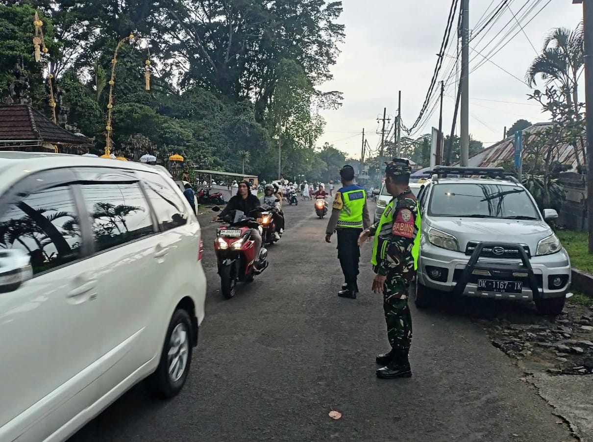 Dalam kegiatan tersebut, Babinsa bersama Bhabinkamtibmas turut membantu mengatur arus kendaraan dan memastikan keamanan di sekitar lokasi pura agar masyarakat dapat beribadah dengan nyaman. Selain itu, Pecalang Desa Adat juga aktif melakukan pengawasan di area pura serta membantu menjaga ketertiban jalannya prosesi upacara.